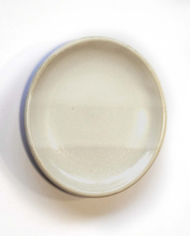 Glaçure en poudre blanche opaque, semi-mate à brillante avec de petits cristaux blancs.