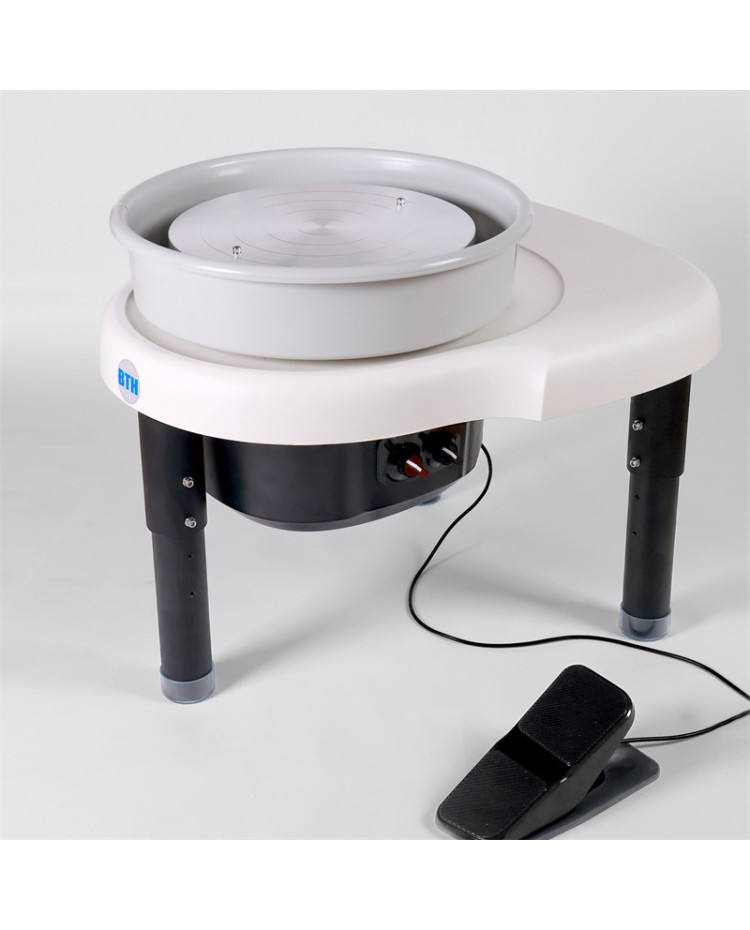 Le BTH DD03 « Direct Drive » est un tour de potier innovant et ergonomique à entraînement magnétique. Il a été conçu pour les potiers qui veulent de la puissance, de la précision et des performances à un bon prix. Ce tour a été conçu pour les potiers professionnels, mais il convient également aux débutants, car il est facile à contrôler. La pédale souple et facile à utiliser permet un réglage confortable et précis de la vitesse. Protection innovante contre les éclaboussures : un bac à éclaboussures en deux parties et un support avec aimant pour un nettoyage facile.